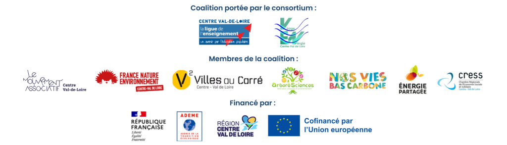- La coalition regroupe 10 acteurs dont l’objectif est d’instaurer une culture commune, durable et valorisante de la sobriété dans le secteur associatif, en vue de préparer les acteurs associatifs à la mise en œuvre d’actions de sensibilisation efficaces auprès du grand public ! (Virage Energie, Le Mouvement associatif Centre-Val de Loire, France Nature Environnement Centre-Val de Loire, la Région Centre-Val de Loire, ArboréSciences, Nos vies bas carbone, Energie Partagée, CRESS Centre-Val de Loire, COP Centre-Val de Loire, Villes au Carré)
